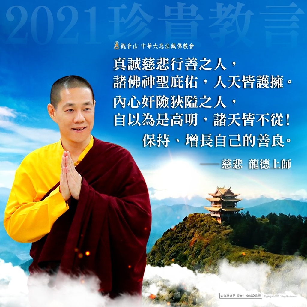 慈悲 龍德上師:「做為佛弟子,『環保』最要緊是吃素,減緩暖化,達到環保的實質效益;第二、飲食習慣的簡約,無毒沒有公害的生活方式,不要造成生活環境的污染;第三、臺灣是海島可以淨灘,我們應該去發起,去推動!」